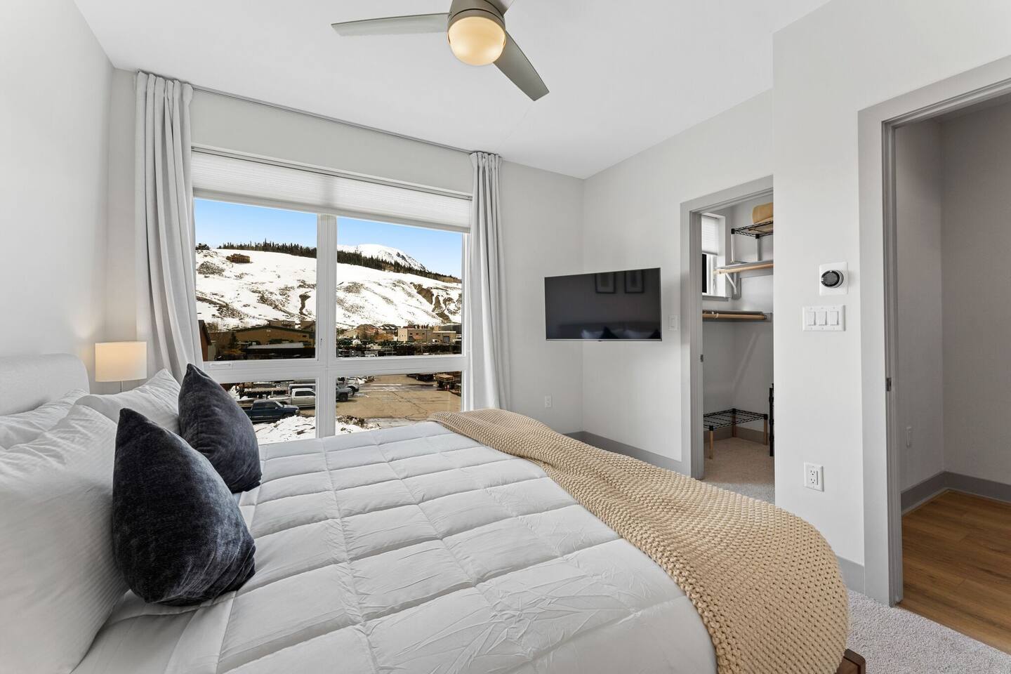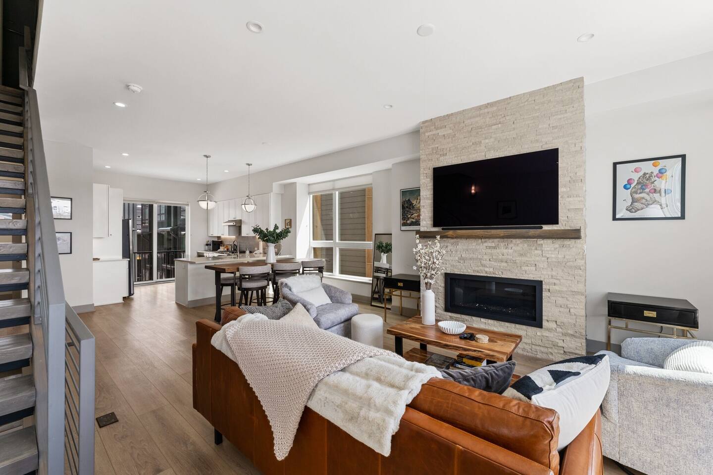 Newly built in 2023, the Fourth Street Crossing complex provides guests with convenient access to Silverthorne's shops, restaurants, and amenities, including Bluebird Market, which is just minutes away on foot. Centrally located making for convenient access to all the attractions of Summit County. This modern townhouse has a favorable triple aspect enjoying ample all day natural lighting. Accommodation for up to 8 guests in 3 bedrooms with king bed, queen bed, and bunk bed (plus pullout trundle bed) making this property ideal for extended families, groups of friends as well as couples looking for space and privacy. Enjoy the beautiful surroundings, luxury amenities and finishes including fully fitted kitchen, gas fire place and high-end furnishings. New technology includes WiFi 6e, 3 wall-mounted 4K TVs, soundbar, office workstation, 5 Nest thermostats, etc. Other highlights include hardwood radiant heat flooring, an in-unit washer and dryer, a equipped workspace for remote work, and a private 2 car garage. Experience stunning mountain views from the private south facing roof deck with a hot tub, gas grill, outdoor furniture, parasol and outdoor lighting. Silverthorne is the ideal year round gateway to explore popular destinations such as Breckenridge, Vail, Copper, Keystone, Dillon, Frisco and Steamboat.